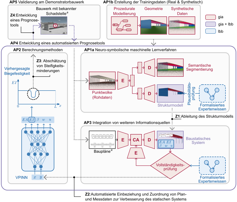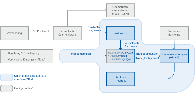 This is where the Scan2SAM project comes in. The goal is to investigate the methodological foundations for developing a prediction tool. This tool will automatically generate a structural model and, in a second step, a structural analysis system by enriching the model with boundary conditions, using semantically segmented 3D point clouds as input. The resulting system can then be used for numerical analysis of the structure. Based on this system and SHM data, the stiffness distribution will be predicted using Variational Physics-Informed Neural Networks (VPINNs). This prediction can then be used to identify damaged areas within the structure (see Fig. 1)