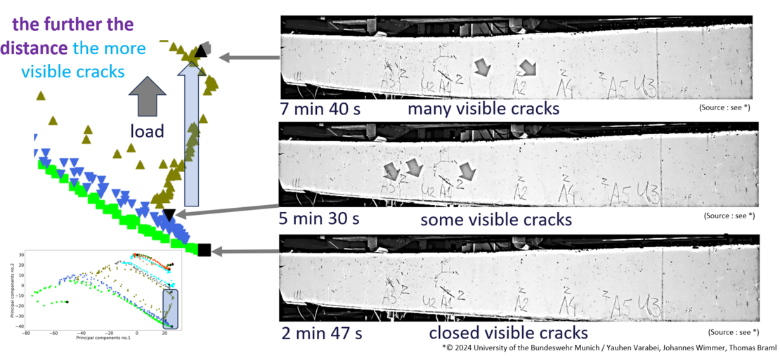 SHIPs combine classic and modern pattern recognition: PCA distil damage-sensitive indicators; CNNs and physically informed models (PINNs) will capture nonlinear behaviour and support forecasting. Previous laboratory and field studies (reinforced concrete beam tests and on-site investigations at the Heinrichsbrücke Bamberg; >13-month data sets) show that PCA clusters separate states, while temperature trending sharpens correlations with actual bridge behaviour. Thus, state changes appear detectable. The challenge is now to trace the changes in data patterns observed in existing structures back to their physical and mechanical causes.