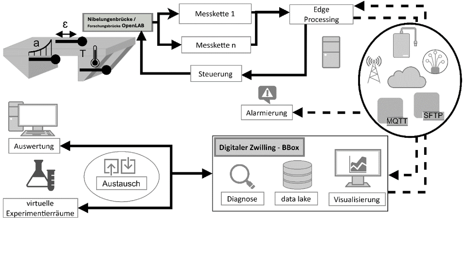 The goal is automated data preparation as the basis for analysis in WP 3. To this end, (1) algorithms for the automated preparation and integration of inspection and monitoring data into the AAS are being developed, (2) methods for the automated generation of training data sets will be established – based, among other things, on published scripts and extensive data sets (e.g., Isenbrücke Schwindegg) as well as data from the Nibelungenbrücke and OpenLAB – and (3) the automated preparation/integration for subsequent pattern recognition will be demonstrated in practice.