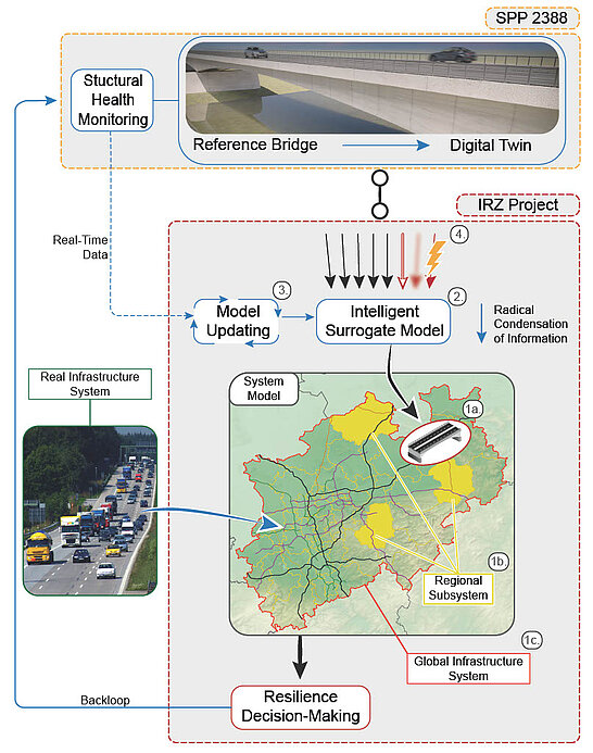 As illustrated in Fig. 2, several system levels are identified at different scales - (1a.) critical technical structures form basic system components, (1b.) regional subsystems represent spatial and functional connectivity, (1c.) all sub-models are aggregated at the global infrastructure system level. This sub-structuring approach not only facilitates the handling of the resulting computational complexity for large infrastructure systems, but also enables precise localization of critical regions and components. At the component level, (2.) an intelligent surrogate modeling procedure based on automated machine learning is developed to condense the vast amount of data available for the SPP 2388 reference bridge into a probabilistic, time- & state-continuous surrogate model. A corresponding (3.) model updating procedure fits the real-time data collected by SHM to the surrogate model to ensure accurate predictions.Uncertainties arising from (4.) conflicting, vague, or incorrect (real-time) data will be quantified and propagated through the systemic model. At the regional subsystem level, critical infrastructure components are linked and integrated into a newly developed system reliability model that enables comprehensive yet efficient numerical analyses. Further reduction of the complexity of subsystem models is achieved by clustering similar components into component types.