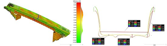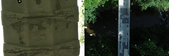 Auf Basis dieser Daten können ungenaue, unvollständige oder fehlerhafte Bestandsdaten ergänzt, verbessert und auf einen aktuellen Stand gebracht werden. Als Nebenprodukt ergeben sich dabei auch die Orientierungsparameter der aufgenommenen Bilder (Aufnahmeposition, Blickrichtung und Bildausschnitt), die zur Erleichterung der visuellen Interpretation beitragen. Aus den Bilddaten können durch automatisierte Verfahren der Bildanalyse hochauflösende Rissbilder generiert werden, die über die Orientierungsparameter der aufgenommenen Bilder direkt in die Geometrie des digitalen Zwillings transformiert werden können. Auch Zustandsparameter wie Oberflächenrauigkeit oder Überhöhung sind aus den Daten ableitbar Ein besonderes Augenmerk liegt auf der Bestimmung von Materialstärken (bespielhaft dargestellt in Abbildung 3, rechts) aus Bild- und Laserscannerdaten, was gezielte Modifikationen photogrammetrischer Datenakquisitionsschemata mit besonderem Fokus auf die Fehlerfortpflanzung in großen Bildverbänden bedingt.