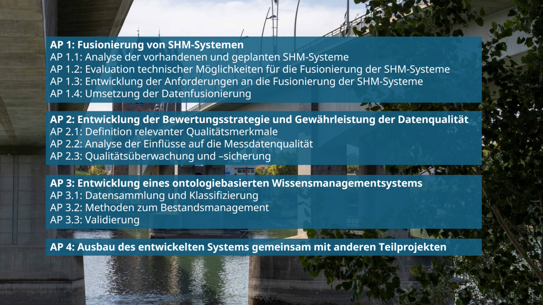 In Phase 2 liegt der Fokus auf der Integration der verschiedenen SHM-Systeme, die in Phase 1 und Phase 2 von den Teilprojekten entwickelt wurden und werden, um ein fusioniertes, kollaboratives SHM-System zu realisieren. Dazu wird die bestehende Datenplattform inklusive des initialen SHM-Systems des SPP 100+ in Phase 2 weiterentwickelt, um den wachsenden Anforderungen gerecht zu werden. Zusätzlich wird eine erweiterte Nutzeroberfläche entwickelt, die eine einfachere Navigation und ein verbessertes Benutzererlebnis ermöglicht, sodass sowohl erfahrene Forscherinnen und Forscher als auch neue Nutzerinnen und Nutzer problemlos auf die Daten zugreifen und diese analysieren können. Parallel dazu werden Methoden entwickelt, um die Qualität aller generierter Daten sicherzustellen und deren Verlässlichkeit zu erhöhen. Darüber hinaus wird eine Strategie für ein intelligentes Wissensmanagement ausgearbeitet. Diese Strategie wird nicht nur Bestandsdokumente einbeziehen, sondern auch Monitoringdaten integrieren, um einen ganzheitlichen Ansatz der Wissensverwaltung zu schaffen. Zur Umsetzung der gennannten Ziele sind vier Arbeitspakete (APs) vorgesehen (siehe Abbildung 2).