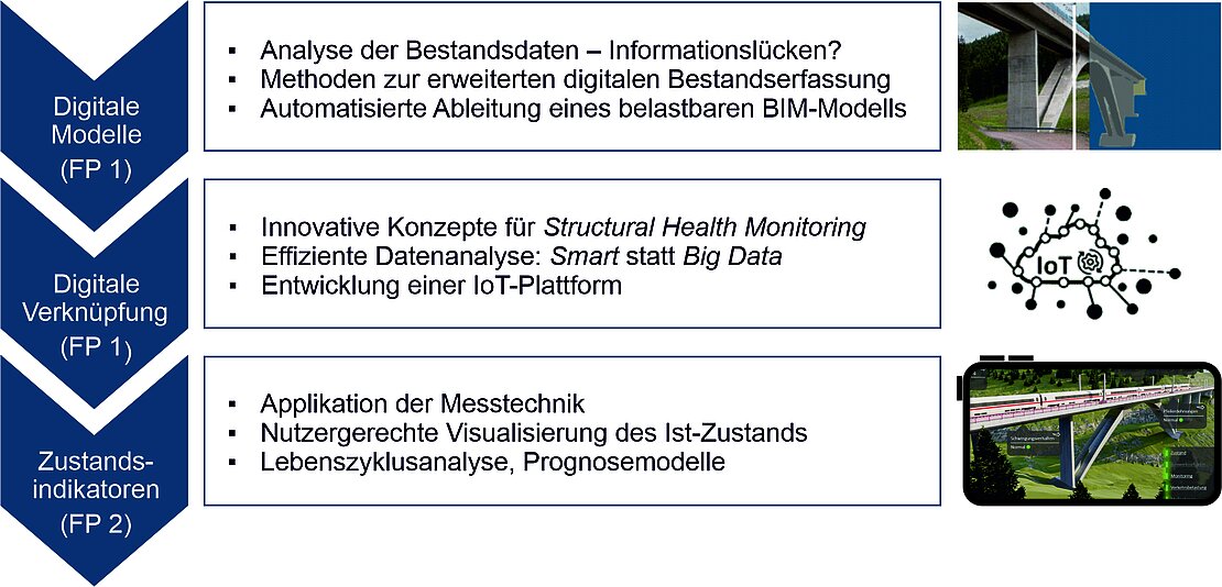 Im Koordinationsprojekt wurde in der ersten Förderphase intensive Begleitforschung betrieben, um die Nibelungenbrücke als Demonstrator aufzubauen. Es wurden As-designed- und As-built-Modelle, ein Structural Health Monitoring (SHM)-System und eine umfassende Datenaustauschplattform entwickelt.